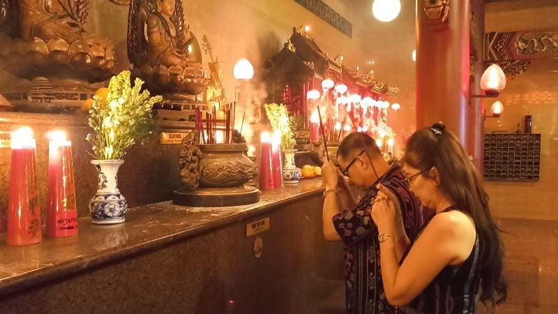 Suasana semarak terpancar sejak sore hari, saat aroma dupa mulai merebak mengiringi lautan peziarah yang membawa persembahan dan harapan. Tepat pukul 19.00 WIB, bunyi tambur mulai menggema dari altar utama, menjadi pertanda akan dimulainya doa bersama yang dipimpin Pandita Dhamma Amaro.